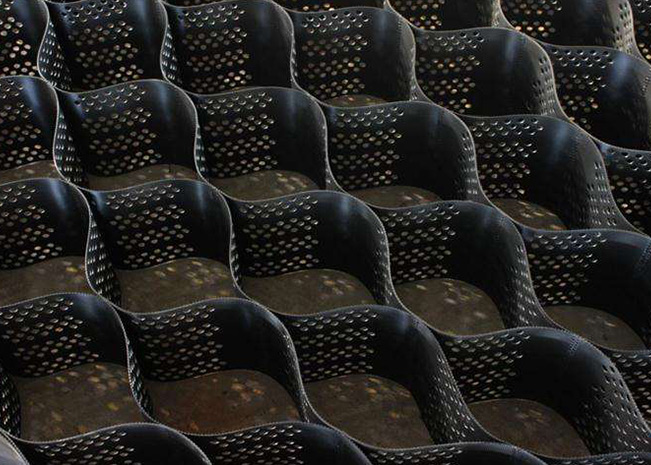 土工格室是由強化的HDPE片材料,經高強力焊接而形成的一種三維網狀格室結構。一般經超聲波針式焊接而成。因工程需要,有的在膜片上進行打孔。